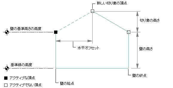 壁のルーフ ラインに切り妻を追加するには、次の操作を実行します。 切り妻の追加は、プロパティ パレットの[ルーフ ライン/フロア ライン]ワークシートで行うこともできます。