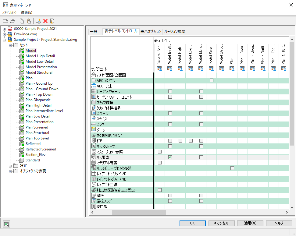 | 表示セットのすべてのオブジェクトにすべての表示レベルを割り当てるには | [オブジェクト]見出しエリアを右クリックし、[すべての表示レベルを選択]をクリックします。 |