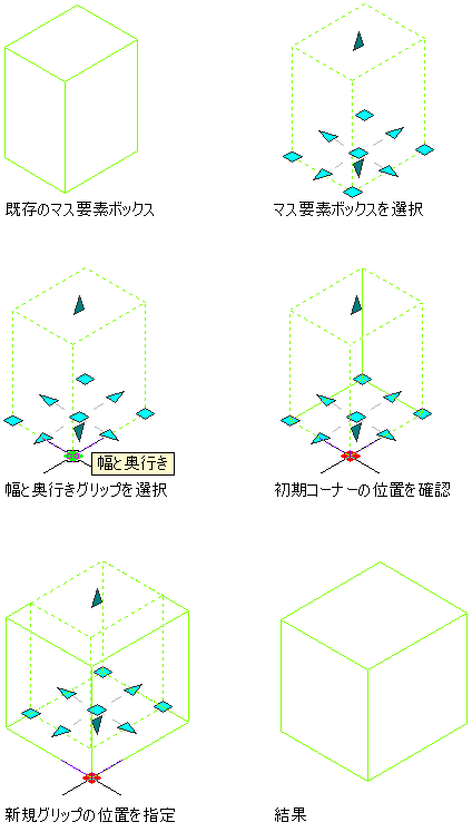 グリップを使用して矩形マス要素のエリアを変更するには、次の手順を実行します。矩形マス要素とは、底面に 4 本の線分がある要素のことで、アーチ、半円筒ヴォールト、ボックス、切り妻、角錐、二等辺三角形、直角三角形などが含まれます。