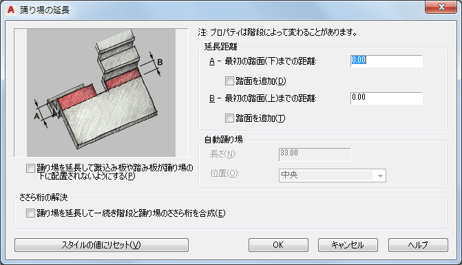 踊り場と踏み板間の距離や、階段のささら桁の解決を変更するには、次の手順を実行します。踊り場コンポーネントのサイズを、一続き階段に使用されている踊り場コンポーネントと異なるサイズに設定することができます。