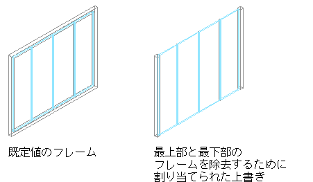 優先設定として[なし]を指定すると、フレーム エッジは表示されなくなりますが、隣接する面材は、エッジが占めていた空間に拡張されません。
