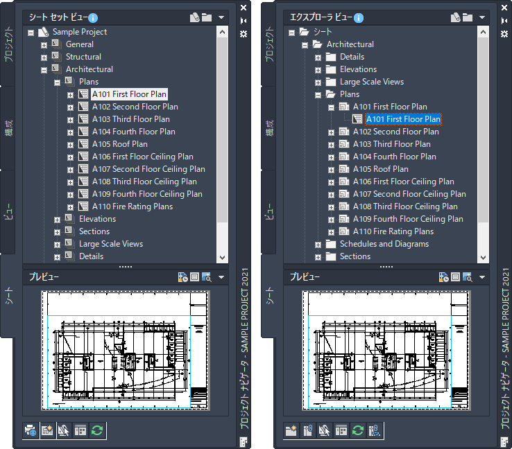 プロジェクトの[シート セット ビュー]が表示された[シート]タブ(左)と[エクスプローラ ビュー](右)
