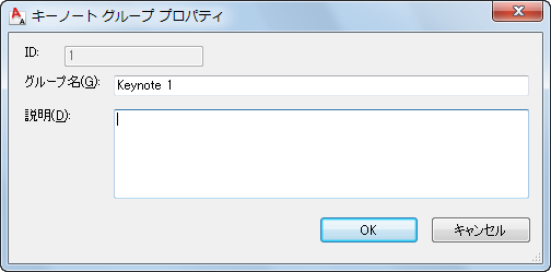 編集するキーノートのデータベース識別子を示す読み込み専用の ID フィールドが付いた[キーノート プロパティ]ダイアログ ボックスが表示されます。