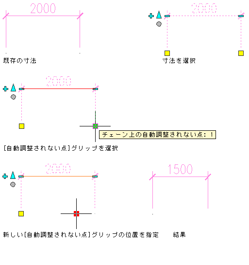 追加した各点に対し、寸法補助線の終点に位置グリップが追加されて、チェーン上の寸法が更新されます。