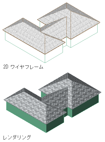 2D のワイヤフレーム ビューとレンダリング ビューで屋根を表示