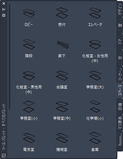 ワークスペースの既定のツール パレットには、スペース ツールが用意されています。そのまま使用することもできますが、必要に応じてカスタマイズすることもできます。 さらに、ソフトウェアに付属している次のカタログには、ツール パレットに追加できるスペース ツールが登録されています。
