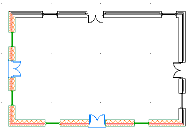 次の例では、オーバーレイとして挿入された外部参照図面のオブジェクトは、薄色表示設定(北と東の壁、ドア、窓)を使用します。ホスト図面は、標準表示設定(南と西の壁、ドア、窓)を使用します。