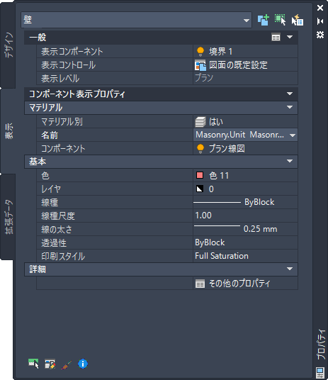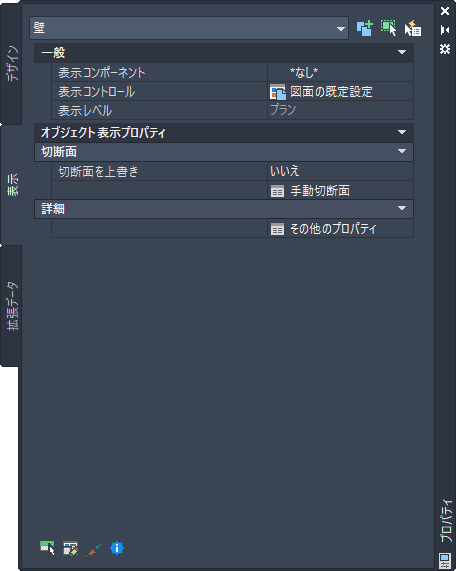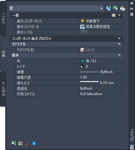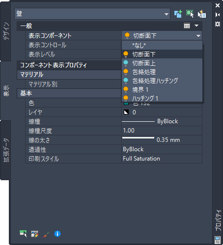 現在の表示レベルで、選択したオブジェクトの表示プロパティ設定を変更するには、プロパティ パレットの[表示]タブを使用します。オブジェクトに全体として適用するプロパティ([切断面の高さ]など)の設定、およびオブジェクトの個別の表示コンポーネント(ハッチング コンポーネントの[色]、[レイヤ]、[線種]など)の設定を変更できます。