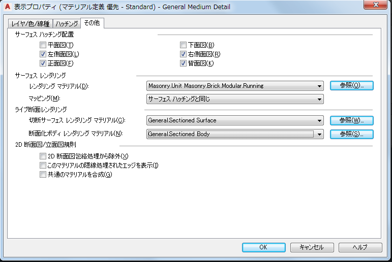 によってアクセスするダイアログ ボックスでは、下に示すように、サーフェス ハッチング配置やサーフェス レンダリングなどのマテリアル定義に関連付けられている表示プロパティを表示したり修正できます。