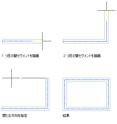 このオプションでは、壁に指定した最後の点から、この壁グループに指定した最初の点まで壁セグメントを作成することにより、壁を閉じます。 壁を配置するときに、このオプションを使用するには、コマンド ラインでcと入力します。