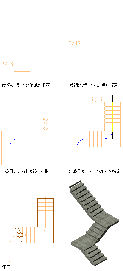 複数の踊り場がある階段を作成するには、次の手順を実行します。複数の踊り場がある階段形状を使用して、直進階段と曲がり階段の両方を定義することができます。1/4 踊り場、1/2 踊り場、1/4 ターン、1/2 ターンを挿入できます。