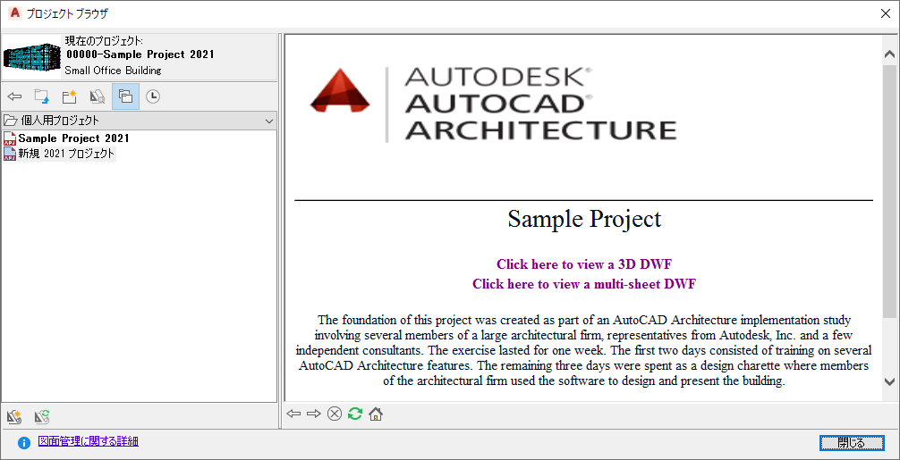 プロジェクト ブラウザを使って、新しいプロジェクトの作成、プロジェクト設定とプロジェクト標準仕様の設定、詳細情報の追加、現在のプロジェクトの選択などが行えます。コンテキスト メニューからまたはファイル名をダブルクリックすることにより、プロジェクトを現在に設定すると、プロジェクトは AutoCAD Architecture 2027 toolsetの現在バージョンと互換性のある形式に移行されます。プロジェクトのパスも変更すると、すべてのプロジェクト図面も移行され、前バージョンのソフトウェアではプロジェクトを開くことができなくなります。