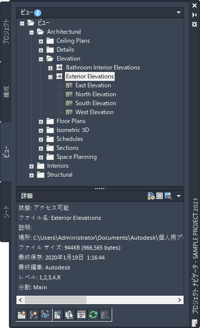 プロジェクト ナビゲータの外部立面図モデル空間ビュー