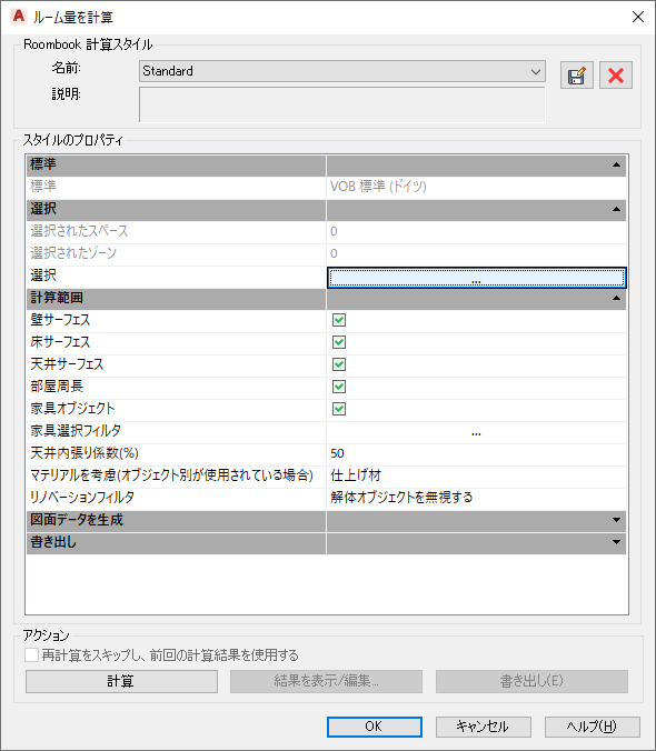 - ルーム量計算後に図面に新しいスペースやゾーンが追加されている場合、このオプションは、その新しいスペースやゾーンを次回の計算に自動的に含めるかどうかを指定します。既定では、このオプションはオンになっています。