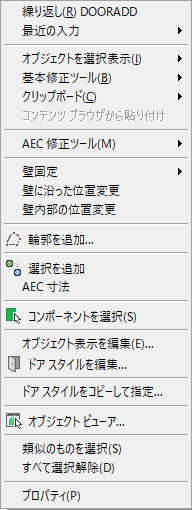 作図領域を右クリックしたときに表示されるコンテキスト メニューの内容は、現在選択しているオブジェクトによって異なります。たとえば、1 つまたは複数のドア オブジェクトを選択していると、ドア特有のコンテキスト メニューが次の図のように表示されます。