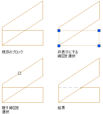 線図のある領域を他の線図との関係において隠すには、次の手順を実行します。この機能は、ある図形の後方に別の図形がある場合、前方の図形の影になる後方の図形を隠して表示したい場合に便利です。隠された線図は、HIDDEN レイヤ キーで指定したレイヤに配置されます。いったん[隠す]コマンドを開始すると、使用する長方形の 2 つの角を指定することもできます。