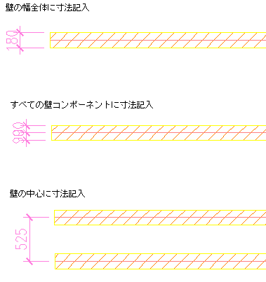 個々の壁コンポーネントの寸法を記入するためのさまざまなオプションがあります。壁スタイルでは、それぞれの壁コンポーネントに対して寸法記入設定を定義できます。各コンポーネントは、片方または両方のエッジ、およびコンポーネントの中心に寸法を記入することができます。特定のコンポーネントには一切寸法を記入しないようにすることもできます。