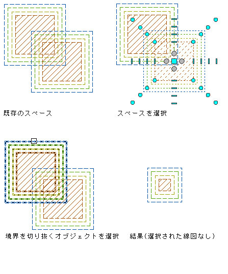 スタイル定義の境界オフセットが設定されたスペースを交差させると、両方のスペースの基本境界が互いに交差し、最初のスペースのスタイルで定義された境界オフセットが、交差の結果得られるスペースに適用されます。