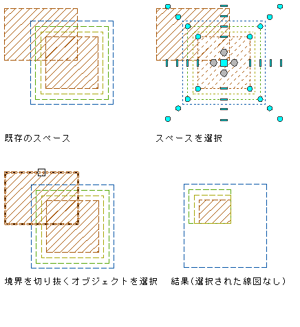 最初のスペースの手動スペース境界がアクティブ化されていないと(グリップを表示)、交差操作で使用されません。 これにより、最初のスペース上の既存の境界がそのまま残り、2 番目のスペース上の対応する境界が削除されます。 その結果、スペース境界が不規則になることがあります。 これを避けるため、最初のスペース上の関係する境界を必ずすべてアクティブ化してください。