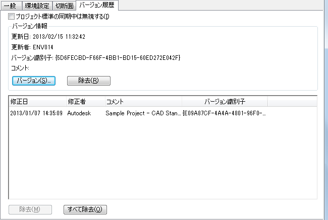 プロジェクト標準図面上の各表示設定には、バージョン履歴があります。バージョン履歴には、一意のバージョン識別子、変更の日付と時刻、ユーザ名とユーザが入力した追加のコメントが表示されます。
