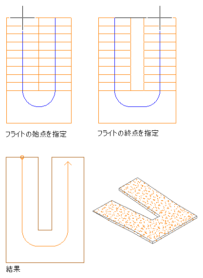 傾斜の作成には、傾斜のささら桁のタイプを使用する必要があります。ささら桁の切り子面の表示コンポーネントには、傾斜用の踊り場ラインがいくつか用意されています。[終了方法]を[踏み板]に設定すると、傾斜とそれが接する面との間に蹴上げが設けられるのではなく、次のレベルとの連結が正しく行われるように踏み板が作成されます。