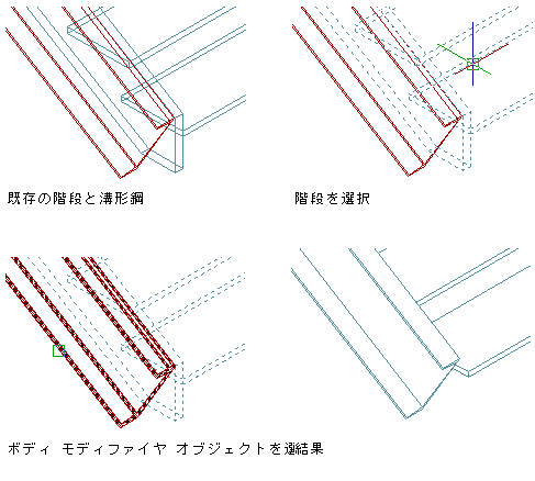 次の図に、溝形鋼をボディ モディファイヤとして使用し、階段のささら桁コンポーネントと置き換える方法を示します。