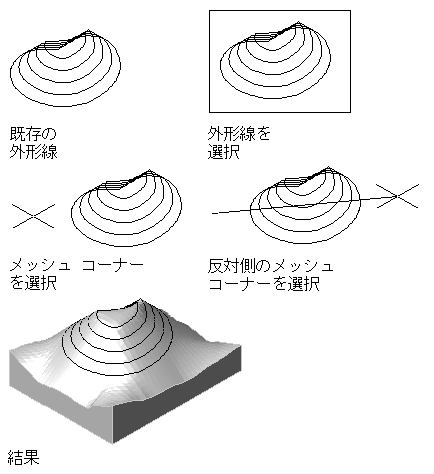 非標準メッシュには、ユーザの指定したサイズの長方形メッシュ(選択した長方形の範囲が等高線の曲線と点で覆われたエリアより大きい場合には、トポロジは入力値から推測されます)か、サーフェス サイズと形状が入力した等高線曲線と点のエリアで決定される非長方形メッシュのいずれかを選択できます。