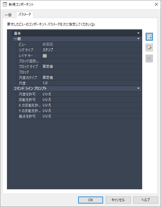をクリックします. [コンポーネント プロパティ]ダイアログ ボックスが表示されます。読み込み専用 ID フィールドには、コンポーネントが属しているグループのデータベース識別子が表示されます。多くの場合には、このダイアログ ボックスの[一般]タブと[パラメータ]タブにある値を編集できます。サポートしている 6 つのタイプ(スタンプ、ブックエンド、線形配列、サーフェス、サーフェス線種、サーフェス トップ)以外のジグを使用するコンポーネントでは、パラメータは[パラメータ]タブに表示されません。