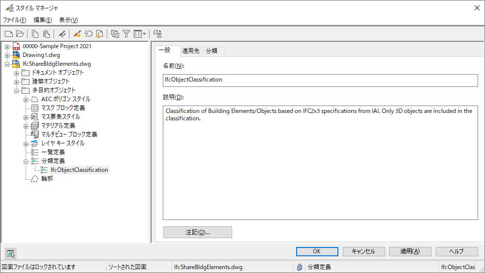 この図面を IFC ファイル形式で書き出すと、分類定義も書き出されます。 分類定義は、図面の書き出し時にオブジェクト タイプにアタッチされます。