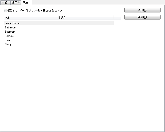 一覧定義は、スペースとゾーンの名前付きの一覧です。一覧定義をスペース スタイルまたはゾーン スタイルにアタッチすると、そのスタイルを使用して挿入されたすべてのスペースまたはゾーンはこの一覧の名前を使用します。 建物の標準に従ってスペースの名前の一貫性を確保するなど、一覧定義はさまざまな目的で作成されます。