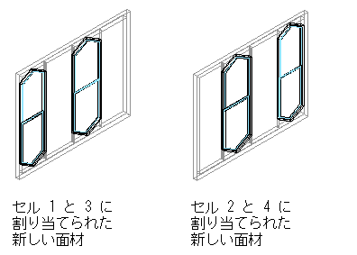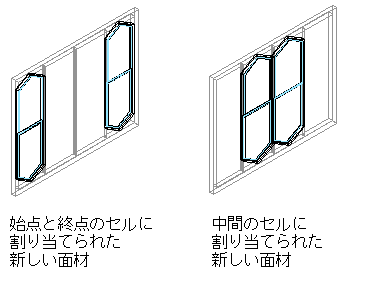 - [位置]を使用すると、面材を、垂直グリッドの始点、中央、終点のセルに、または水平グリッドの下、中央、上のセルに挿入することができます。セルの数が偶数(4 以上)の場合、[中央]はグリッドの中央の 2 つのセルを表します。セルの数が奇数(3 以上)の場合、[中央]はグリッドの中央の 1 つのセルを表します。