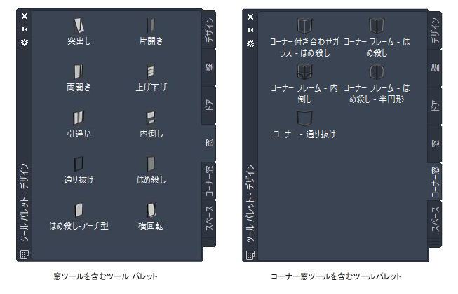 | CAD マネージャによって作成されたカスタム ツール パレット | プロジェクト用またはオフィス標準用にカスタマイズされた窓スタイルとプロパティを含む窓ツールが含まれています。 |