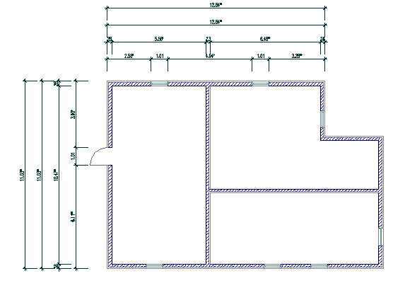 次の例では、壁の長さ、開口部の幅、および壁交差が、寸法記入される点としてスタイルで設定されています。ドアの幅を広くすると、新しい計測値を反映して寸法が更新されます。