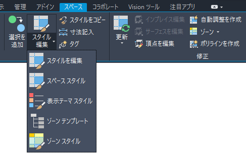 選択したオブジェクトに応じて、そのオブジェクトのスタイルだけでなく、サポート オブジェクトとして機能するオブジェクトのスタイルにもアクセスできます。たとえば、スペースを選択した場合、スペース スタイル、ゾーン スタイル、ゾーン テンプレート、表示テーマ スタイルにアクセスできます。