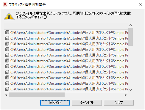 別のユーザが現在開いているプロジェクトや、読み込み専用のプロジェクトを完全に同期すると、それらは同期から除外されます。プロジェクトの同期を開始する前に、プログラムは内部チェックを実行して、この時点で同期できない図面がないか確認します。同期できない図面が見つかると、[同期警告]ワークシートが表示されます。