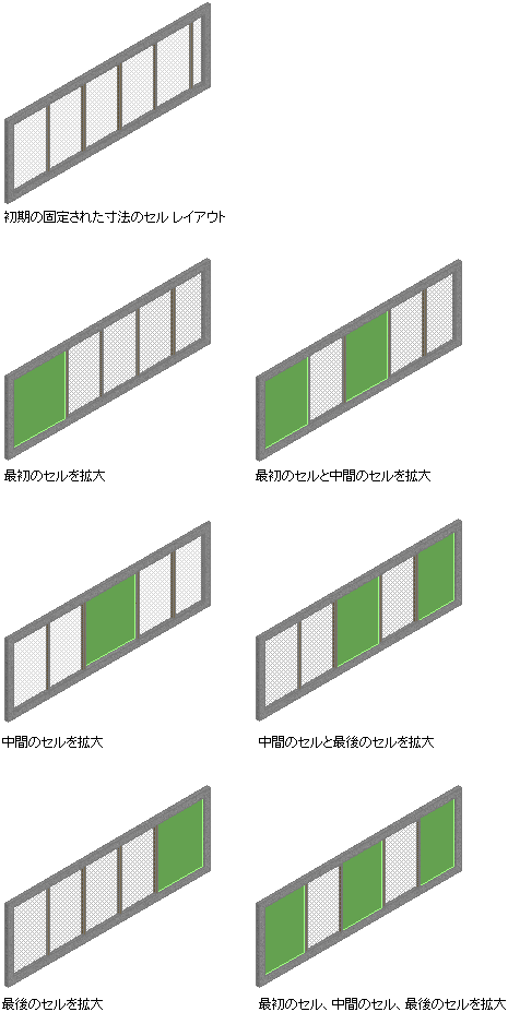 グリッド分割を自動調整するには、最初、中間、または最後のセルもしくはこれらのセルの組合わせを指定して、セルの拡大を受け入れます。各セルのサイズは、指定したセルの組合わせによって変わります。下の図は、ある組合せ窓について考えられるセル拡大の組合わせを示します。ハイライト表示されたセルは緑色となります。