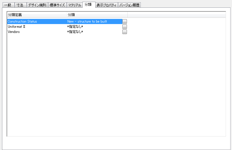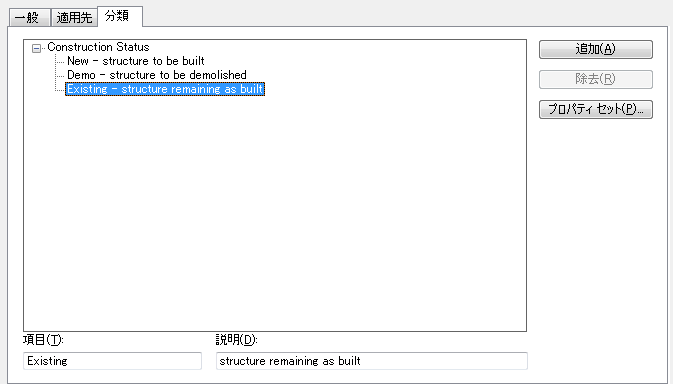 既存、デモ、新規などの各建築ステータスの分類を含む分類定義を作成できます。