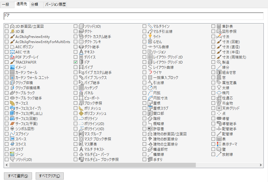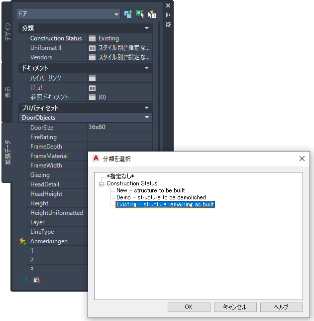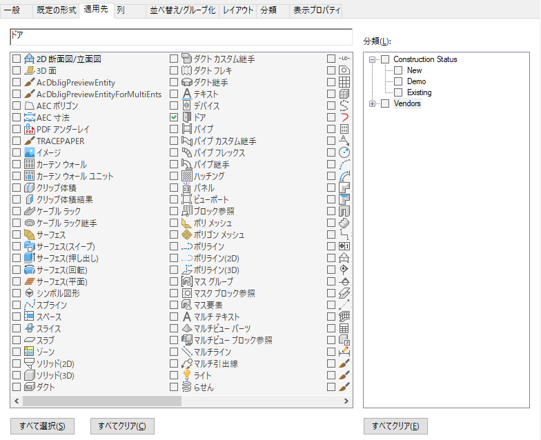分類定義は、オブジェクト スタイル プロパティの[分類]タブに一覧表示されます。 オブジェクト スタイルで、新規などの分類を選択します。 たとえば、図面に、既存のドアについての特定のドア スタイルがいくつかと、新規に作成するための別のスタイルがいくつか含まれているとします。これらのスタイルから作成されたドアには、いずれもそれぞれのスタイルで指定された分類が割り当てられます。