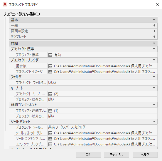 標準、イメージ、キーノート、詳細コンポーネント、ツール パレットなど、プロジェクトの詳細なプロパティを定義または変更できます。