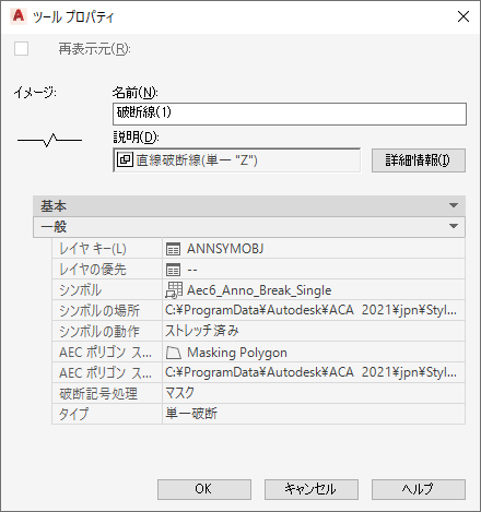 - 破断線ツールでは、破断線記号と同じ図面に支援要素を含めます。集計タグなどの他のマルチコンポーネント ツールと同様に、将来の変更が容易になります。破断記号がオブジェクトをマスクするかトリムするかを含め、破断記号のプロパティは、すべてツール プロパティ内で設定します。