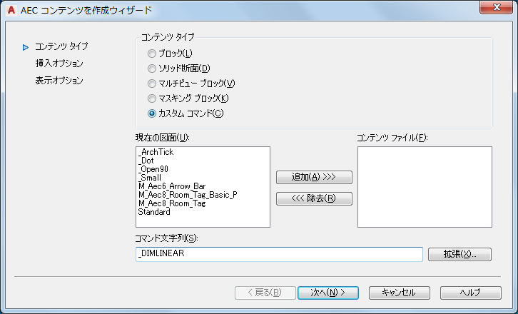- 標準の AutoCAD 寸法用のツールを作成する場合は、AEC コンテンツ ウィザードを使用します。これにより、[カスタム コマンド]オプションとレイヤ キーを使用して、寸法が正しいレイヤに配置されるようにできます。