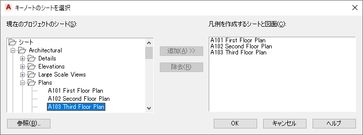 | 他のシートからのものも含めてすべてのキーノートを含める | 右クリックして[シート]をクリックし、[キーノート凡例を作成するシートを選択]ダイアログ ボックスを表示します。左側のペインに、現在のプロジェクトのシートが一覧で表示されます。必要に応じてシートを選択し、[追加]をクリックして右側のペインに移動します。さらに[参照]をクリックして、シートとして保存されている他のプロジェクトまたは図面のシートを取得します。右側のペインに、含めるキーノートを持つすべての図面/シートが表示されたら、[OK]をクリックします。 |