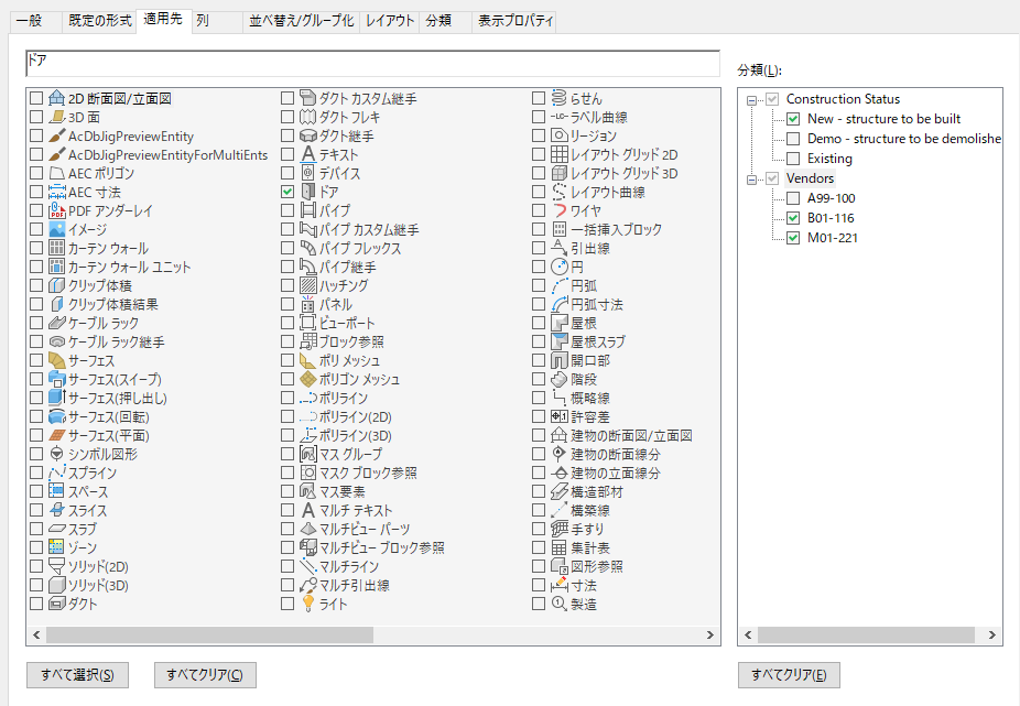 プロパティ セット定義が適用されるオブジェクトと同じオブジェクトに適用されるすべての分類定義は、それぞれの分類の一覧とともに右側に表示されます。 分類を選択した場合、プロパティ セット定義は、右側で選択したすべての分類を保持する、左側で選択したオブジェクトまたはスタイルと定義にのみ適用できます。