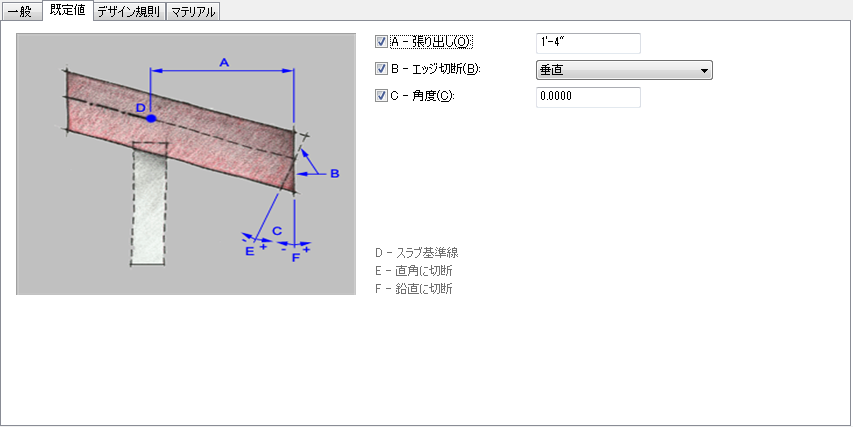 エッジ スタイルを使用しているスラブまたは屋根スラブ エッジに、既定の軒の出の奥行き、エッジ切断、およびエッジ角度を指定するには、次の手順を実行します。
