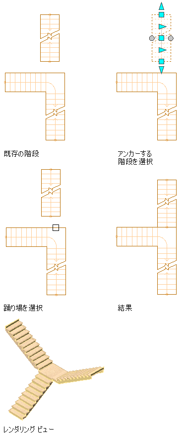 注: [垂直方向]を[上]に設定して作成した階段は踊り場から上に向かって作成され、[垂直方向]を[下]に設定して作成した階段は踊り場から下に向かって作成されます。