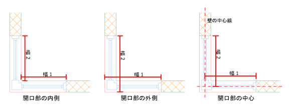 コーナー窓を挿入するときは、開口部の幅の計測を[プロパティ]パレットで以下のように変更できます。
