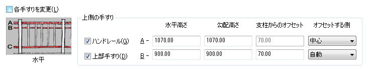 | 手すりを追加または修正するときに、ハンドレールと上部手すりのプロパティ(水平高さ、勾配高さ、オフセット距離など)を指定できるようにするには | [各手すりを変更]をオンにします。 |