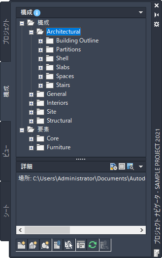 プロジェクト ナビゲータ パレットの[構成]タブでは、プロジェクトの基本的な建物オブジェクトを追加します。