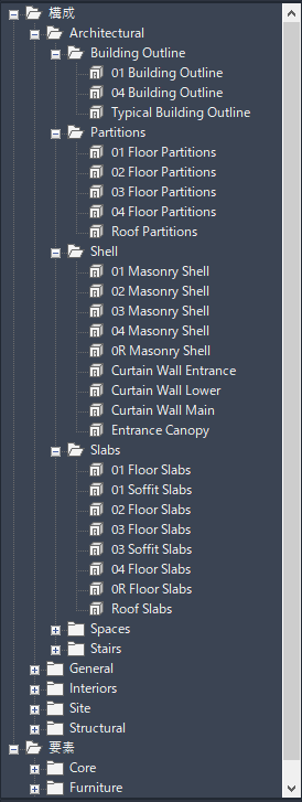 図面エクスプローラは、プロジェクト ナビゲータの[構成]タブ、[ビュー]タブ、[シート]タブに共通のツリー ビューです。図面エクスプローラには、図面ファイルが編成されます。プロジェクト ナビゲータの[プロジェクト]タブ以外のタブには、関連するプロジェクト図面ファイル(要素、構成、ビュー、シート)が図面エクスプローラのツリーとして表示されます。
