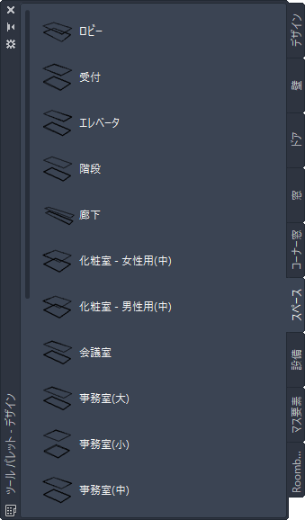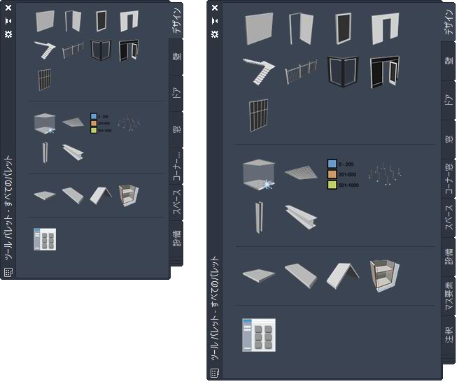 ツール パレット セットの表示は、ツール パレット セット全体に対して指定した設定と個々のツール パレットごとに指定した設定によって決まります。ツール パレット セットで、ツール パレット セットの透過性、サイズ、位置、自動非表示を指定します。